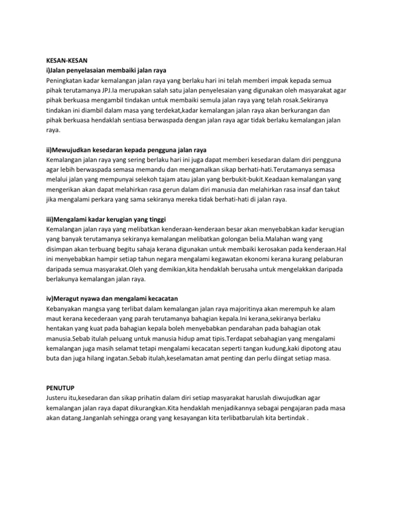 Kemalangan jalan raya ialah peristiwa ngeri yang biasanya melibatkan perlanggaran dua kenderaan atau lebih di jalan raya atau pun lebuh raya. People also downloaded these free PDFs. Kesan amat jelas kerana dengan bersukan sukan mampu meningkatkan swadaya masyarakat dan melangkah gagah dengan yakin ke peringkat antatabangsa walaupun melalui ranjau pidana dunia persaingan hari ini.